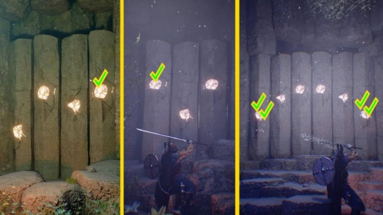 Depending on which stone the sword light is directed at, the columns will move differently. As in the previous cases, you need to align their tops at the same level. Think of three stages: high, middle, and low. For the puzzle, the correct position of the stones is: middle, low, middle.