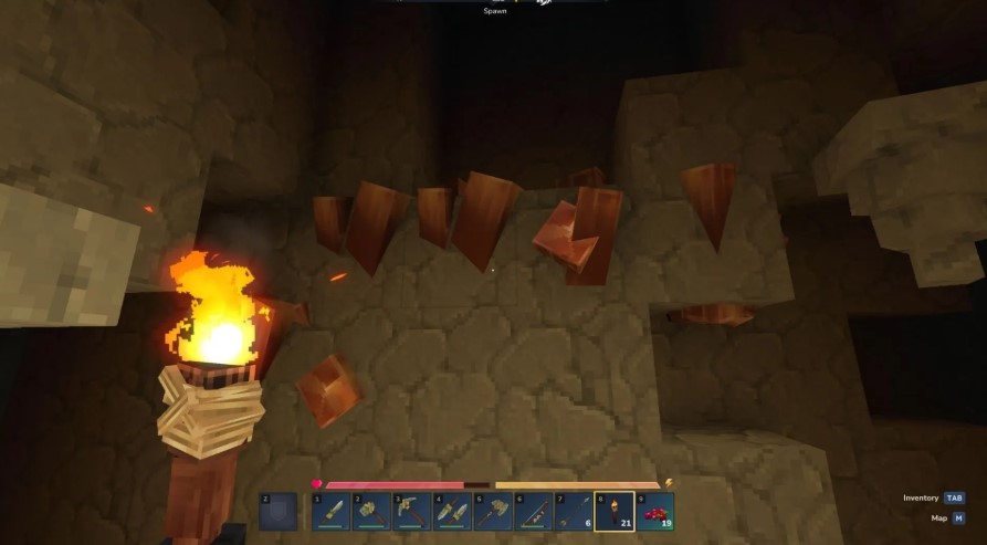 Copper ore deposits can be found at depths of 10 to 20 blocks in Hytale’s dungeons. In-game, they appear as rusty-brown pillars emerging from the bedrock, with whitish patches at their peaks.