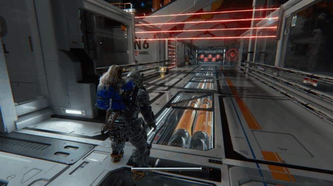 Drop down past the door and you’ll find yourself in a corridor with lasers and a door with five red locks. While you’re avoiding the lasers, be sure to pick up the upgrade component.