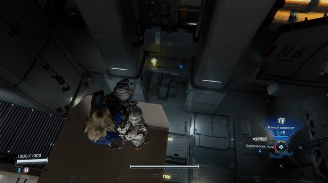 Continue on, pick up your first hacking node, “Decoding,” defeat the enemy, and proceed through the door. On the left, you’ll see a wall lift, and on the right, a passage to a large lifting platform leading further into the story. Before continuing, look up near the wall hatch and find a wall fan with a Minicube on it. Shoot it.