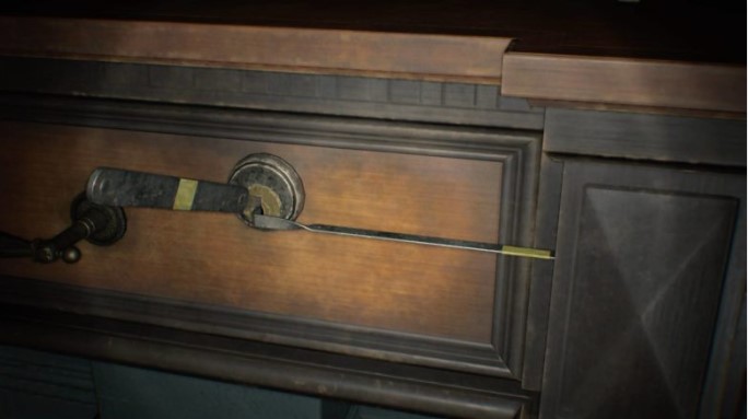 After obtaining the level 1 ID wristband, head west of the living room in the west wing. Pass the kitchen and you’ll find a locked grate, which can now be opened with the ID wristband. Follow the corridor beyond it to the left to find the Overseer’s Room. It contains a typewriter for saving and item storage. Inside the room is also a cabinet containing the second lockpick.